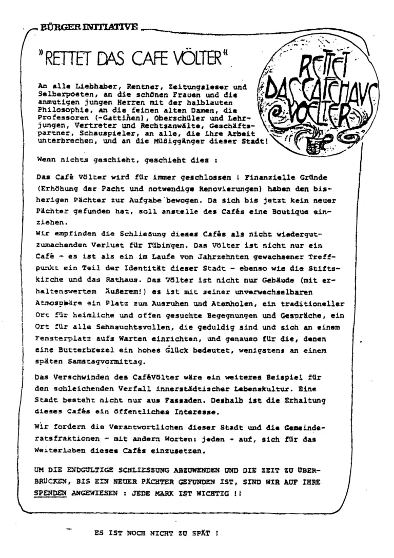 Doch die Liebe der Menschen zu diesem besonderen Ort war stärker: Eine engagierte Bürgerinitiative gründete den Verein “Rettet das Café Völter e.V.” und hauchte der Tübinger Café-Kultur neues Leben ein. Trotz aller Anstrengungen konnte das Café Völter vor der Schließung nicht bewahrt werden.
