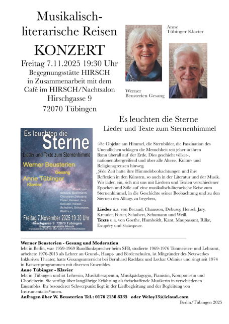Musik & Literatur: In Kooperation mit unserem hausinternen Nachbarverein „Hirsch Begegnungsstätte für Ältere e.V.“ fanden Lesungen und Konzerte in deren Räumen statt.