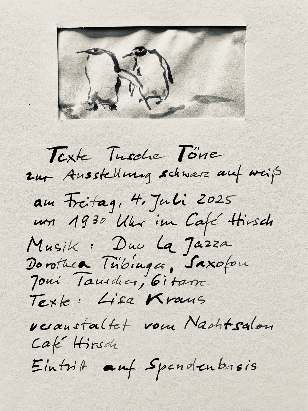 Falls Sie Interesse haben auch unabhängig vom Nachtsalon in den Räumlichkeiten unseres Cafés auszustellen, dann senden Sie uns gerne eine E-Mail mit einer kleinen Auswahl Ihrer Werke oder einen Online-Link zu Ihrem Portfolio.